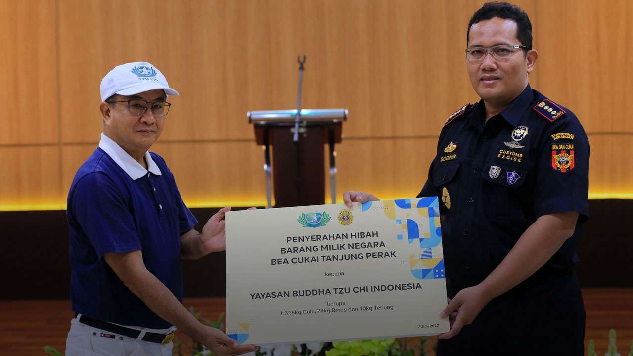 Kegiatan serah terima barang secara simbolis disampaikan langsung oleh Kepala Kantor Bea Cukai Tanjung Perak, Sodikin kepada Wakil Ketua Umum Yayasan Buddha Tzu Chi Surabaya pada Selasa, 7 Juni 2022 di Auditorium Kantor Bea Cukai Tanjung Perak.